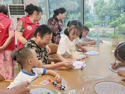 此次活动,不仅让孩子们在暑期获得心理关怀,也让老人们感受到陪伴的乐趣,祖孙间的情感纽带愈发牢固。整个工作坊洋溢着积极向上的氛围,每个人都沉浸在这份珍贵的亲子时光中,享受艺术带来的心灵慰藉。看着原本空白的扇子被五彩颜色填满,大家脸上露出满意笑容。绘画涂色环节不仅激发了孩子们的创造力,也让老人们重温童年乐趣,每一把扇子都成为他们共同创作的艺术品,见证着祖孙间的默契与亲情。