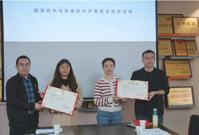 在评课环节结束后,螺溪初中党支部书记、校长谭小明与东观初中党支部书记、校长杨军分别为献课的张倩茹老师和明思扬老师颁发了荣誉证书,并合影留念。这一荣誉不仅是对两位老师辛勤付出的肯定,更是对两校联合教研活动成果的见证。
