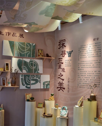走进墨香书画坊的展区,首先映入眼帘的是一幅幅精美的壁画作品。孩子们用细腻的笔触和丰富的色彩,描绘出三星堆神秘的青铜面具、高大的青铜立人像以及精美的玉器。每一笔、每一划都饱含着他们对三星堆文化的敬仰与热爱,仿佛带领观众穿越时空,回到了那个古老而神秘的文明。