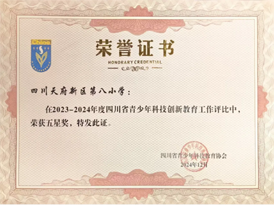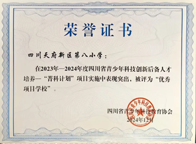年会中,天府四中、天府八小收获满满,两所学校荣获四川省青少年科技创新教育工作五星奖,天府八小还被评为四川省青少年科技创新后备人才培养 “菁科计划” 优秀项目学校。