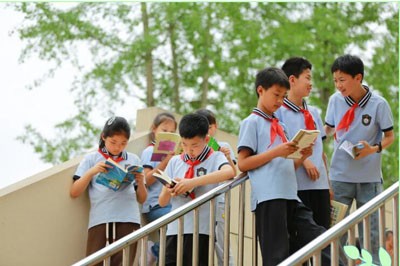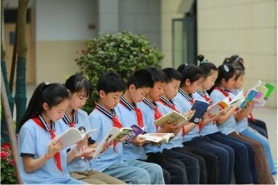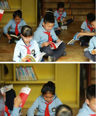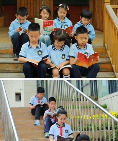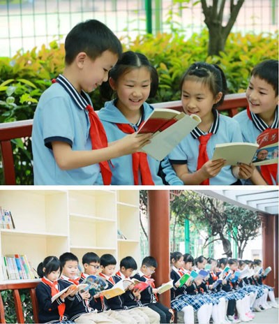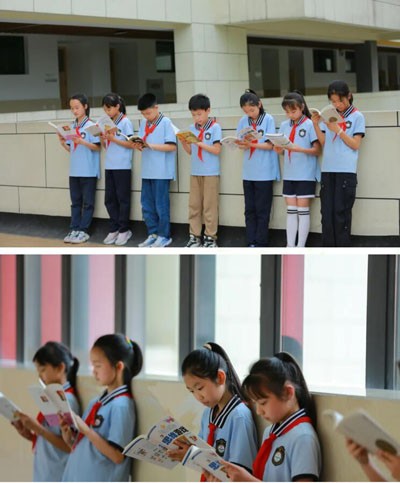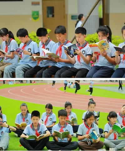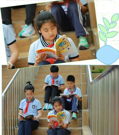 读书只能在教室吗?不是。你瞧——长廊处,三五个孩子沉浸于书中的温情故事;花园中,同学们手中的书与翩翩蝴蝶相映成趣;就连楼梯口,也成了“流动书吧”,学生们倚栏静读,自成风景。