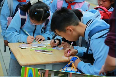 原本素净的车身渐渐变成了流动的书单,承载着孩子们的阅读故事与真挚心意,驶向诗意的远方。
