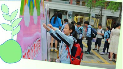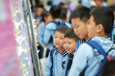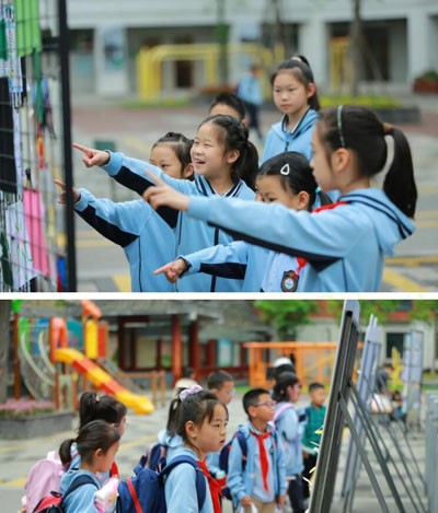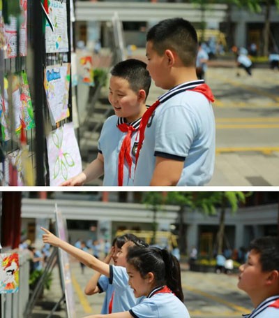 课间时分,学生们簇拥在展板前,指着作品惊呼: