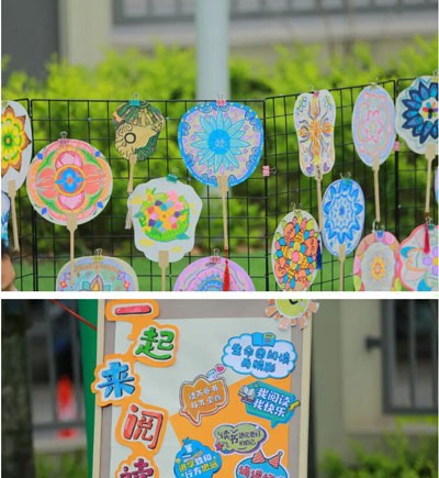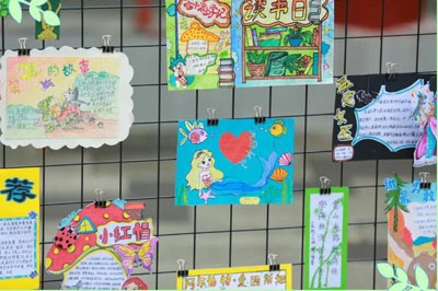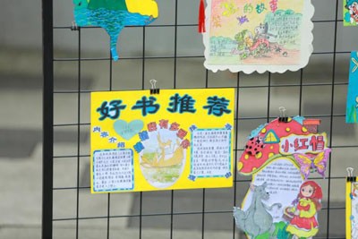 书香长廊边,这里展出着孩子们精心制作的书签和读书小报:水墨风的人物栩栩如生,科幻风的宇宙震撼磅礴,还有卡通版的哪吒充满童趣。