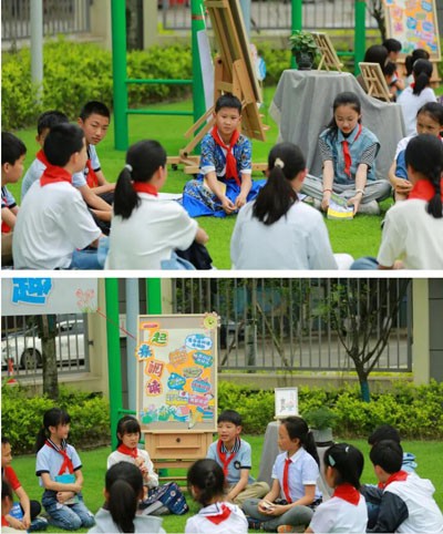 活动伊始,在二年级十三班“我的童年书屋”阅读主题展示暖场节目结束后,阅读倡议人黄文文老师带来“猜猜他是谁”小游戏,让忠诚善良的“稻草人”、神通广大的“孙悟空”、机智勇敢的“雨来”走出书本,来到孩子们中间作为阅读信使邀请大家走进书的世界!