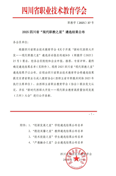 依据四川省职业技术教育学会《关于开展“新时代西部大开发—现代职教之星”遴选活动报名的通知》(职教学〔2025〕25号)要求,经自主申报、单位推荐、资格审核及专家综合评审,最终确定表彰名单。余自涛老师的入选,彰显了其在职业教育领域高尚师德风范、突出的专业能力和丰富的教学创新成果,是“德技并修”现代职教育理念的充分体现。