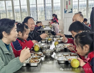 参加调研指导人员在乐德镇小学与师生们共进午餐。(张萍/辑荐)