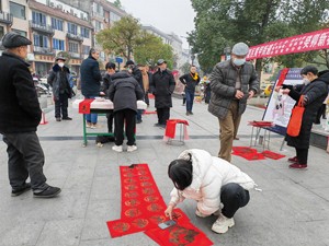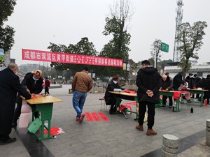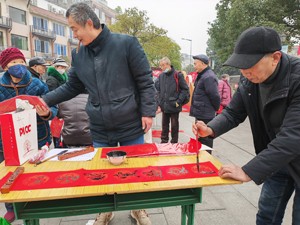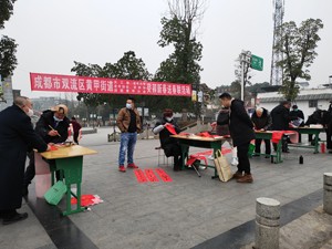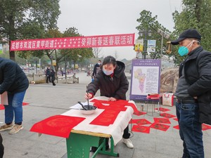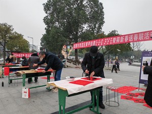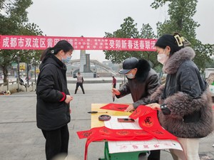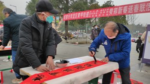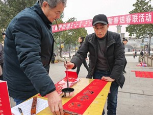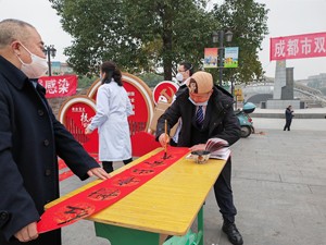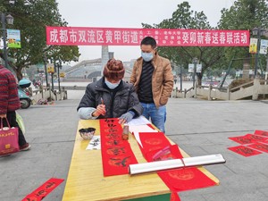 春联,是中华民族延续几千年的传统习俗,它在民间很好的渲染了人们过年的隆重氛围,1月13日上午,成都市双流区黄甲街道关工委、老年大学丶老年协会、老年人体育协会组织了辖区内的14名书法爱好者在黄甲广场开展为老百姓义务免费送春联活动,上午9时,书法老师们齐聚黄甲广场,各自铺开摊位拉开书写序幕,各位老师你一副、我一副很快写出的对联就铺满了一地,两个多小时共写出大红春联750副、福字860张。此活动吸引了来自四面八方赶集和游逛广场的人的目光,纷纷前来领取,不到一刻钟,全部春联和大红福字被人们领了个精光。我们今天这个活动为广大群众过一个欢乐祥和的春节,为家家户户营造节日氛围送上了祝福,表达了我们的心意,得到了群众的赞扬,同时,组织活动的我们也倍感欣慰!(付仕水)