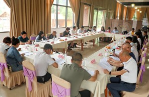 5月5日, 在四川省华蓥市老促会常务理事会召开的一届六次会议现场,参会人员在认真思考研讨内容。