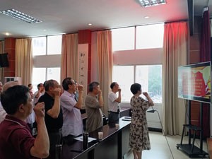 首先,全体党员举起右手,跟着领誓人徐永萍,一句一句地朗读入党誓词。铿锵有力的声音在会议室上空回响,庄严肃穆的面容,表达出全体党员对中国共产党的感激之情,也表达出不忘初心跟党走,勇毅前行谱新篇的决心和信心。