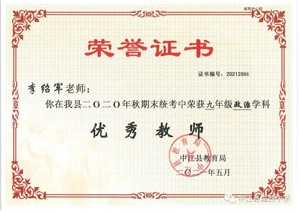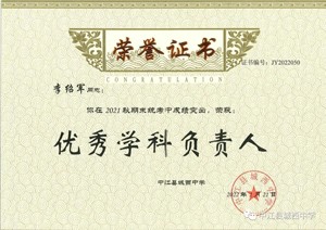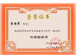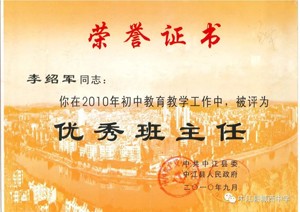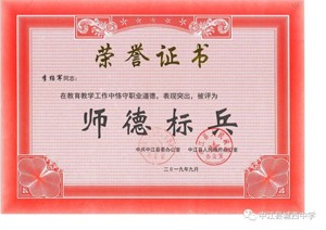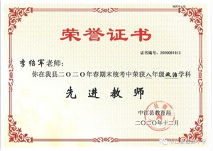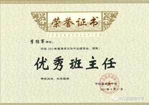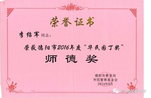 秉持“胸怀天下,以文化人”的教育理念,多年来不仅桃李满天下,还得到县教育局和市教育局的一致好评,2021年被德阳市教育局评为道德与法治学科“先进个人”,中江县人民政府为他颁发”师德标兵“奖状,多次获得县学科”先进教师”“优秀教师”“优秀班主任“等称号。