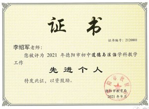 李绍军,中共党员,德阳市道德与法治学科先进个人,中江县优秀班主任、师德标兵、道德与法治优秀学科教师、先进教师。
