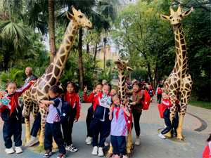 在参观熊猫和犀牛时,孩子们还与这些可爱的动物直接交流与对话。“嗨,熊猫花花,你好啊!”“犀牛先生你好啊!”。看了高大的长颈鹿,我也抱抱“长颈鹿”。孩子们在老师的安全组织下争先恐后的与“长颈鹿”同框合影。