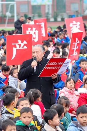 2024年2月26日,四川省华蓥市的普法志愿者在高兴海军希望小学,对刚开学的学生进行爱国主义教育。