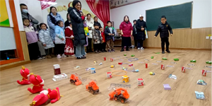 百发百中“套元宵”活动中,场地上整齐列队,从近到远,价值由低到高,摆放了学习、生活用品和孩子们喜爱的玩物礼品,他(她)们手挚塑料套圈,飞圈自如,把一个个礼品套入囊中。