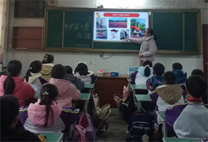 老师向新入队的少先队员讲述大哥哥大姐姐学雷锋公益活动事迹