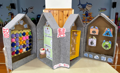 教玩具设计:“什么样的教玩具是孩子需要的?什么样的教玩具是孩子爱玩的?什么样的教玩具是能让孩子探究的?”带着这些疑问,以及教育性、安全性、趣味性、耐用性的制作要求。幼师们根据各班主题精心设计制作了一件件构思巧妙、玩法多样的教玩具。