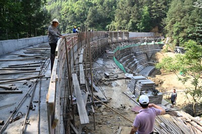 记者看到,历经近50天的施工,大坝在原有基础上,已经长高了3.8米,在长高的3.8米大坝中间,施工人员特意留出了4个大大的孔,这与其它水库大坝与众不同。“这四个孔,叫泄洪孔,当蓄水超过水库安全水位时,‘富余’的水将从这4个孔自然向下流出,还会形成一道很壮观的瀑布哟!再有两天,大坝增高浇筑工程就将全面完成。”施工人员现场介绍。