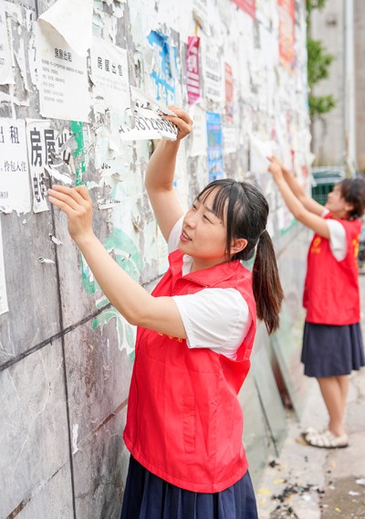 2025年5月28日,四川省华蓥市五星幼儿园的志者在五星安置小区清除墙上的牛皮癣。