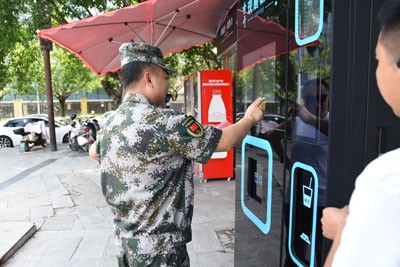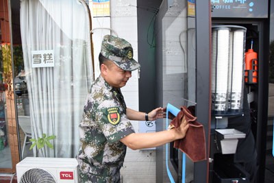 “我来擦拭!”手拿毛巾擦拭咖啡机外部的,也是荣县退役军人志愿服务队队员、“军创”企业“孕婴世界”奶粉店荣县总代理朱攀水。在5人的合力努力下,一个小时后,咖啡机前迎来了自助购买咖啡、奶茶的顾客。