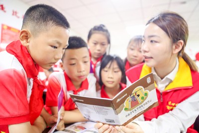 2025年6月18日,四川省华蓥市禄市镇占云小学的学生在翻阅该市供电公司宣传小分队发放的安全用电知识宣传画册。(邱海鹰)