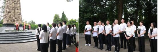 在纪念碑前,全体党员肃立,鞠躬默哀,向长眠于此的革命烈士敬献素雅菊花,表达深切的缅怀与崇高的敬意。