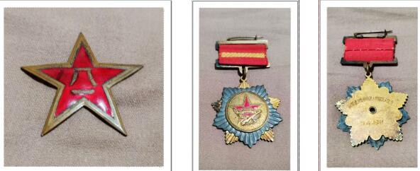 图(1)父亲佩戴在帽子上的“八一”五星帽徽影印件;图(2)父亲1954年2月17日获得(银铜的、通径为4.4厘米)的“全国人民慰问人民解放军代表贺礼”纪念章正面影印件;图(3)纪念章背面印有“全国人民慰问人民解放军代表团赠”文字影印件。