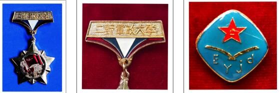 图(1)母亲的二野军政大学纪念章影印件;图(2)纪念章上面有“二野军政大学”文字影印件;图(3)母亲的印有 Eyjd字母和红五星内有八一文字的纪念章,“E”汉语“二”字的声母,“y”汉语“野”字的声母,“j”汉语“军”字的声母,“d”汉语“大”字的声母,连贯起来就是“二野军大”影印件。