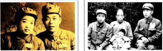 图(1)我的父母戎装结婚照;图(2)我的父亲(左)、母亲(右)带着大女儿回娘家与我外婆游学富(中)的合影留念。