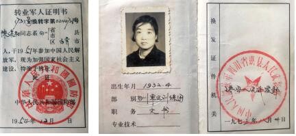 1954年12月中华人民共和国国防部统一颁发给我母亲陈谋和的《转业军人证明书》(73蜀换转字第0240728号),记录有母亲1951年参加中国人民解放军的时间。