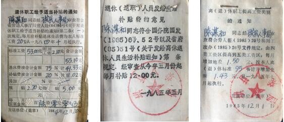 图(1)1984年12月20日,珙县人事局颁发《退休职工给予适当补贴的通知》影印件,我母亲陈谋和退休的标准工资53.00元/月,每月补贴退休生活费为本人标准工资20%,粮食补贴2.70元/月,物价补贴5.00元/月,补贴后退休工资由55.10元/月提高到60.05元/月,还算当时珙县退休工资的中上水平标准;图(2)1985年5月,珙县人事局颁发《退休(退职)人员发给生活补贴费的意见》影印件,我母亲陈谋和退休费增加12.00元/月;图(3)1985年12月1日,珙县人事局颁发《离(退)休职工提高工资类别的通知》影印件,由四类工资区提高到五类工资区,每月增加地差1.5元,按本人离(退)休标准95%计算,我母亲陈谋和增加1.43元/月。