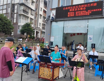 晚会汇聚了社区老科协会员、旅居游客中的文艺爱好者以及龙门山镇白水河社区“红色驿站艺术团”的成员,共计16名业余演员登台献艺。他们带来了丰富多彩的13个节目,包括: 器乐合奏《边疆处处赛江南》女声独唱《江山》(演唱:刘晓华)男声独唱《咱老百姓》女声独唱《我们的生活充满阳光》男声独唱《伊犁河的月夜》男女二重唱《春风十万里》女声独唱《长江之歌》
