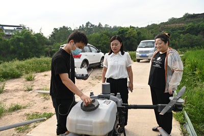 一架无人飞机盘旋在离水稻田20米的上空,“肚”下不停喷出四道白色烟雾,那是潘霞在组织实施200亩水稻病虫防治;两辆“川A”的越野车沿越溪河边的平坦道路驶进刘家坝停下,客人在一块刻有“牛皮洞村”的观景台前拿起长笛吹奏出悠扬的曲子,此情此景的直播立刻进入众人视线。“我从‘盐都潘支书直播间’看到了牛皮洞村的美景,所以今天专程来欣赏,河水奔腾稻花飘香果树满山,还真是一个好地方。”8月28日,远方客人的点赞,饱含荣县县人大代表、新桥镇牛皮洞村党组织书记潘霞的满腔热血和为民初心。