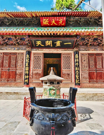 朱红庙门在雨雾中渐显,推开时却见天光乍破——云层裂出一道金缝,恰好照亮门楣"开天明道"四字。守门的老者抚着斑驳门柱说:"这庙自明弘治年立起,五百年间,哪怕瓦当碎了、梁柱朽了,先人们也总要按原样补好。因为这不是普通的庙,是咱华夏人认祖的地方。