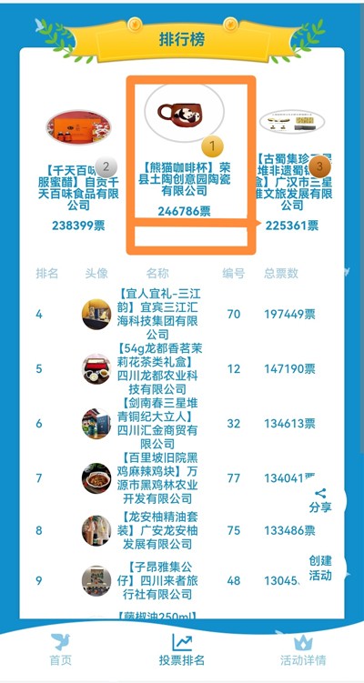 采访获悉,评选活动发起后,荣县土陶创意园积极响应,推送了刘勇大师匠心制作的“熊猫咖啡杯”系列作品参加评选,通过历时10天的网上投票,“熊猫咖啡杯”在众多参评“伴手礼”中始终遥遥领先,最终以246786票脱颖而出,获得本次线上评选第一名。