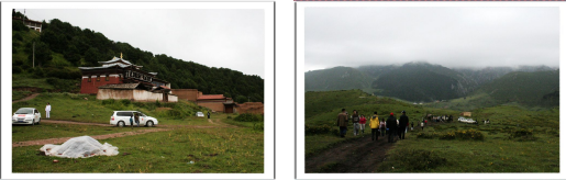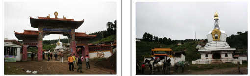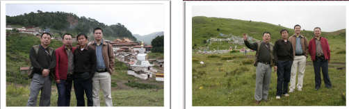 左图:我们四人以朗木寺为背景留张影表明到此一游,左起我、杨兴浪、丁汝崇、周勇;右图:我们以天葬场所作为背景留张影表明到此一游。