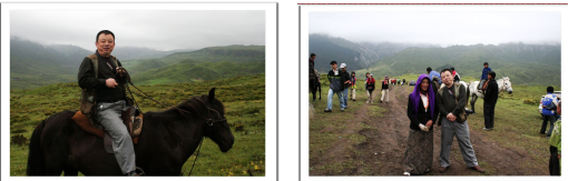 我刚一跨上马背,大脑一下就有弦晕的感觉,心里特别慌,深怕摔下来。其原因是多方面的,一是第一次骑马,根本不适应;二是本身有恐高症,平时站在三楼以上的阳台边都不敢直接往下看;三是身上背有两部没有保护设施的照相机,一只手又要拿照相用的三脚架,深怕率下来损坏相机;四是马在爬坡时本来就不好掌握平衡,马走起路来还一摇一晃的、东倒西歪的、一颠一跛的不怕也得怕,内心的恐慌无法用处语言描述,真有点后悔,知天命的人了,何必硬撑呢?还没让我表露出来,同伴杨兴浪却直接地表露了出来,他高声地喊着——我怕!我怕!我有点晕了,我下来走都要得啊?