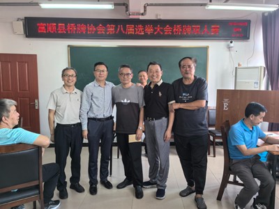 10月15日,富顺县桥牌协会召开换届选举大会暨桥牌双人赛。会员们以认真负责的态度选举产生了新一届富顺桥牌协会的领导班子成员,黄显贵当选为新一届富顺桥牌协会主席。大家表示将以更加饱满的激情推动富顺桥牌运动的提升和发展。自贡市桥牌协会副主席兼秘书长牟位学,富顺县老体协会长周正聪及全体协会会员参加会议。