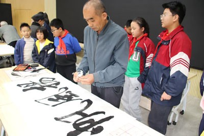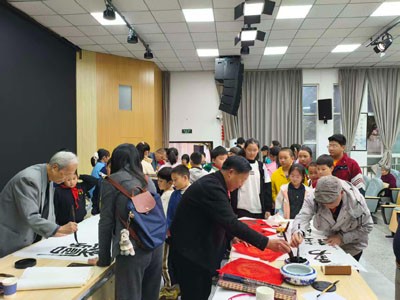 4点,在赵卉主任的权利配合下,学校学术厅,举行了传承中华书法艺术的活动。首先,首任部长、诗书画全才、92岁高龄的侯正桂老师,向几十位书法兴趣团队的小学高年级同学,介绍了中国书法艺术的产生、特色、作用。尤其是讲到了,学习书法,在青少年成长过程中的重要作用。使同学们明确了,汉字书法艺术,是世界上所有文字中,独一无二的书写表现艺术。也明白了,学习书法,可以陶冶情操、磨炼意志、强身健体。从而增强了民族自豪感,也增强了传承书法艺术的责任感,同时,激发了学习书法艺术的兴趣。接着,诗书画部的老师们,走上讲台,铺纸蘸墨,为同学们现场展示书法艺术的魅力,同学们围着仔细观看。随着老师们手中的笔,在宣纸上,点停行顿、飞舞腾挪,一幅幅激励大家刻苦学习、茁壮成长的书法作品,迅速产生。同学们拿在手上,欣喜万分,备受鼓舞,还不断地请老师们为他们书写自己喜欢的励志条幅。