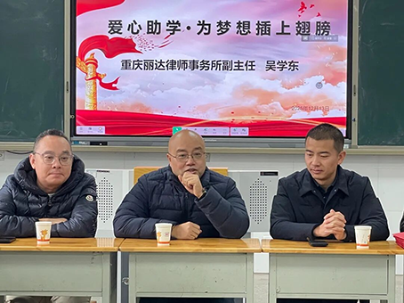 2025年12月13日,川渝爱心团队──重庆丽达律师事务所副主任吴学东等社会爱心人士到沐川县底堡学校开展以“川渝爱心助学底堡·助力学子逐梦成长”为主题的助学活动。乡党委书记、关工委主任袁鑫野、川渝爱心团队以及沐川县底堡学校校长、关工委主任李泽斌共同参与,10名贫困学生及他们的家长一同见证这一爱心时刻。