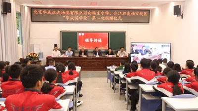 活动中,福宝中学校友、北京华成运达物流有限公司安有兵董事长再次向福宝中学捐赠10万元,他指出,“ 2022年4月,我们公司首次向合江县福宝职业中学校捐赠了10万元,设立了“华成奖学金”。这一爱心基金的设立,旨在鼓励山区学子成才,助力乡村振兴。今天,我们进行第二次捐赠。我始终铭记,小时候因为家庭困难,得到了政府和学校的关爱和帮助。今天,我希望能够将这份爱传递下去,通过“华成奖学金”激励更多的学生追求卓越,成为社会的栋梁之才。也希望华成公司的这一善举能够激励更多企业和个人关注教育,关注国家和民族的未来。”
