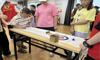 活动现场热闹非凡,家长和孩子们热情高涨,积极参与到各个项目的挑战中。本次趣味运动会涵盖了桌上冰壶挑战、飞盘战棋、世运会知多少、四平八稳小游戏4个与世运会相关的项目。桌上冰壶挑战区,家长在旁边助威,孩子们手持冰壶推杆,全神贯注地瞄准目标,轻轻一推,冰壶在特制的赛道上滑行,在感受冰壶运动魅力的同时,也锻炼了自己的专注力和判断力。