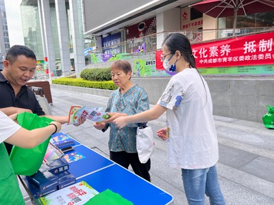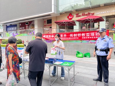 为了深入推进反邪教警示宣传教育活动,筑牢全社会反邪教思想防线和行动自觉,2025年6月26日上午,成都市青羊区委政法委联合青羊区西御河街道办事处和西御河派出所在富力广场开展反邪禁毒传宣传活动。