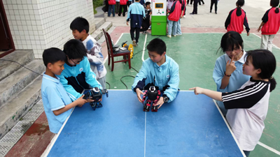 无人机表演,县科协科普老师手把手教学生操作无人机,无人机在校园上空时而高时而低,引起同学们阵阵掌声和欢呼声。