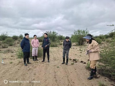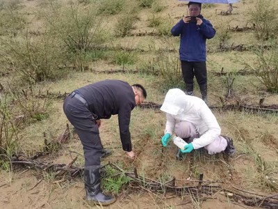 成都华宏生物科技董事长,国家沙漠治理专家李智强(站立者)正与科技人员查看草原沙漠化植被生长情况