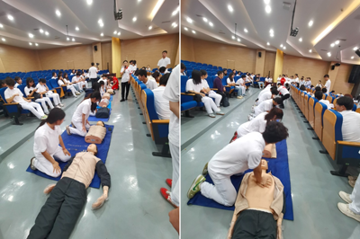 随后,赵小兰专家以饱满的热情,为大学生自愿者详细介绍了“心肺复苏”的操作流程与重要细节。她的生动讲解极大调动了现场气氛,同学们积极响应,踊跃参与实践。现场一字排开十余组模拟人,大家争相上前练习,在专业指导下认真完成每一个步骤,学习氛围热烈而有序。