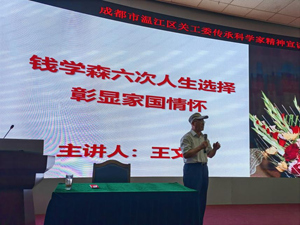 报告会由温江区关工委主办、温江中学承办,特邀成都市老科协科学普及专家服务团队带头人、钱学森研究者王文华高级工程师作宣讲。王文华高级工程师长期从事对科学家钱学森的研究,作出了突出贡献,在全国各地宣讲钱学森的事迹和爱国情怀报告100多场次。此次宣讲报告,王文华老师以《钱学森六次人生选择彰显家国情怀》为题,作了精彩生动的讲述。钱学森从立志铁道报国到航天救国,再到航空理论、创立工程控制论、成就两弹一星、重回学术理论研究、助力民族复兴六次人生选择,每次都体现了他对科学的追求和对祖国的忠诚,他用自己的言行诠释了什么是真正的爱国主义精神。