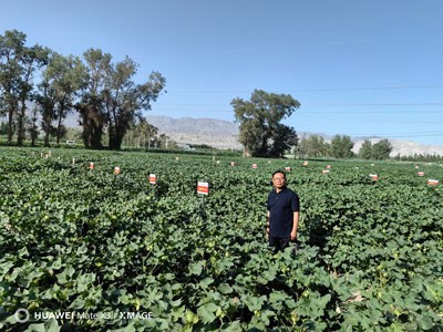 成都华宏生物科技公司董事长,全国著名沙漠盐碱地改良专家李智强在新疆棉田里观测棉花生长情况