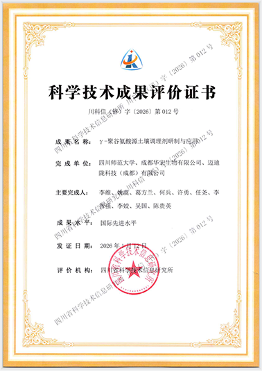 该项目由四川师范大学牵头,成都华宏生物科技有限公司,迈曲陇科技公司共同完成的″r一聚谷氨酸源土壤调理剂研制与应用"项目顺利通过综合评价。专家组一致认为:该成果整体达到国际先进水平,技术就绪度达TRL8级,该级别是该评价中的顶尖级别,意味着,该项目在国际农业项目中有所突破,而成果已通过真实环境中的所有测试。 (特约报道员 郑光明)