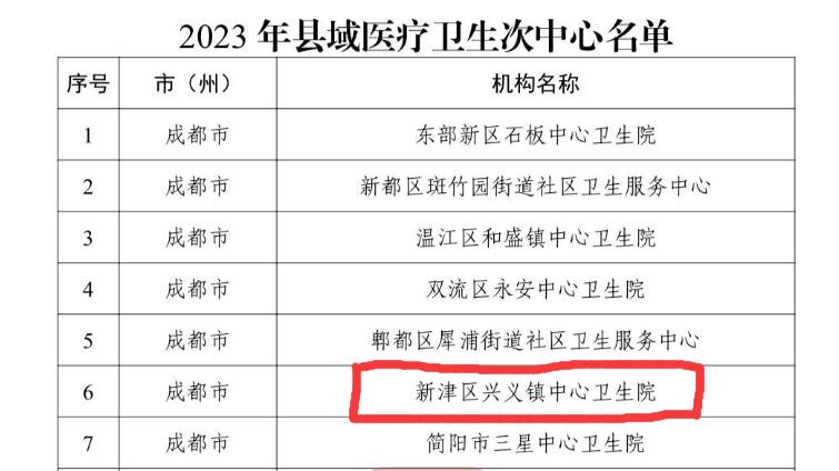 新津区兴义镇中心卫生院创建于1952年,位于成都市新津区兴义镇青竹西巷120号,是一所集预防、保健、康复、健康教育、计划生育、基本医疗六位为一体的国家一级乙等卫生院。医院以“精业济民、兴医惠民、承故纳新”为院训;以患者为中心、以质量为保障、全心全意为人民健康服务的理念,具有“精勤求索、务实重干”的精神,努力打造“技术精湛、服务周到、群众满意”的医院。先后被评为国家级“群众满意乡镇卫生院”、“全国中医宣传示范点”、“省级示范乡镇卫生院”、“成都市人口和健康文化示范点”,获得“成都市2016-2019年度乡镇卫生院医疗质量检查优秀单位”,2019年通过了“优质服务基层行”推荐标准。2019年列入新津区人民医院紧密型医共体医院,2021年医院纳入全区次中心建设规划;2023年与成都市第五人民医院结成了对口支援单位。